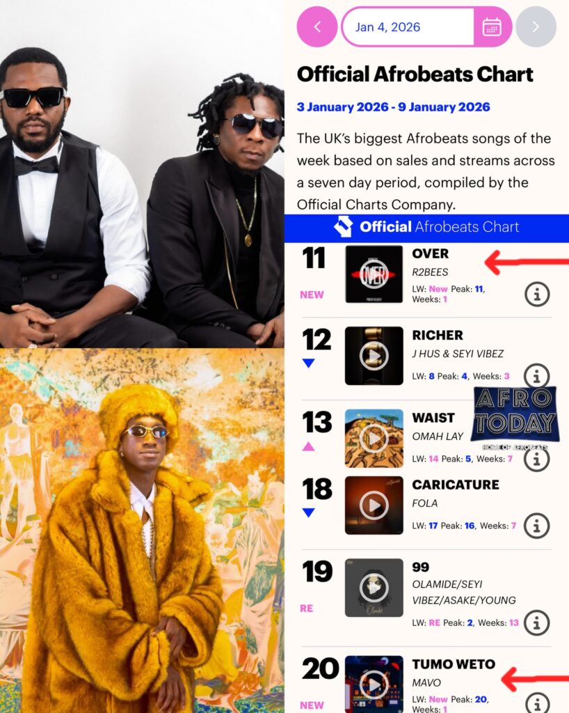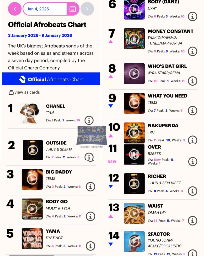 The Official UK Afrobeats Chart has been updated for the first week of the year, January 3–9, 2026, highlighting the hottest songs, biggest debuts, and top movers in the Afrobeats scene. Here’s the full breakdown: