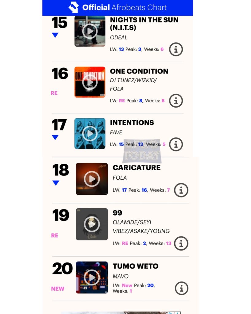 DJ Tunez / Wizkid / Fola – “One Condition” at #16 https://youtu.be/qjV03SMeQB0?si=RpLy-3cqMAbqGCT0